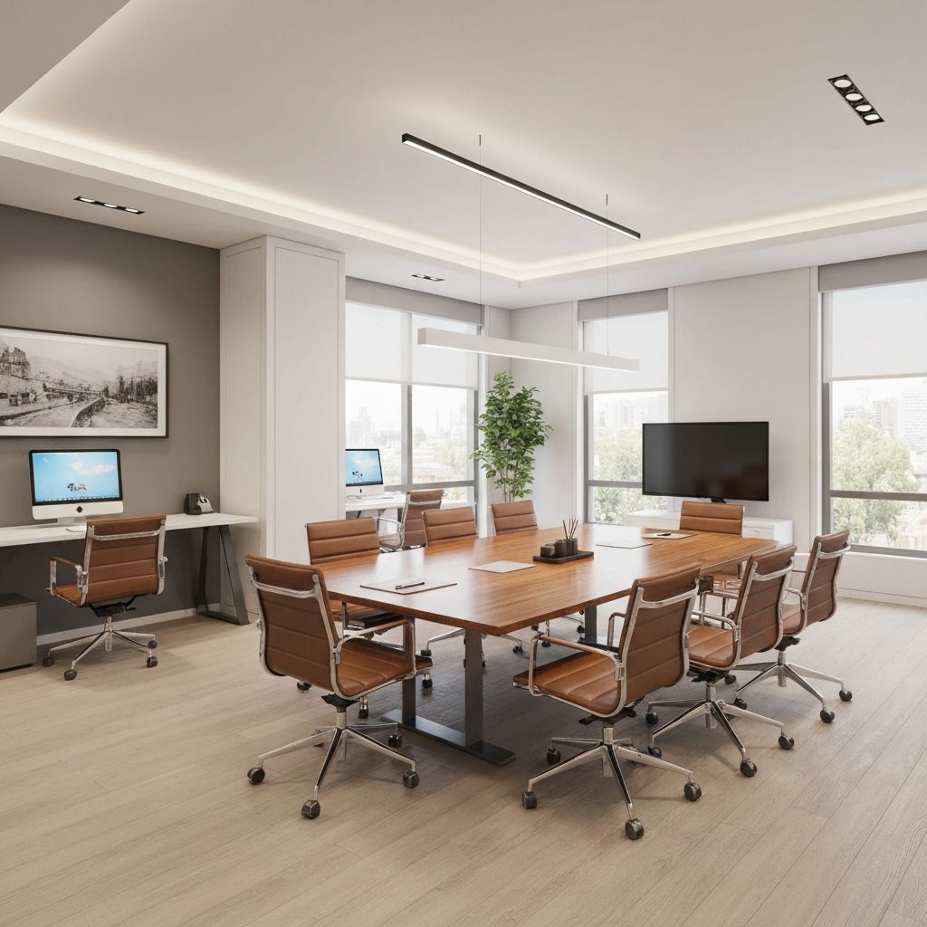Professional office interiors including workstations, cabins, meeting rooms, reception areas, and collaborative spaces.